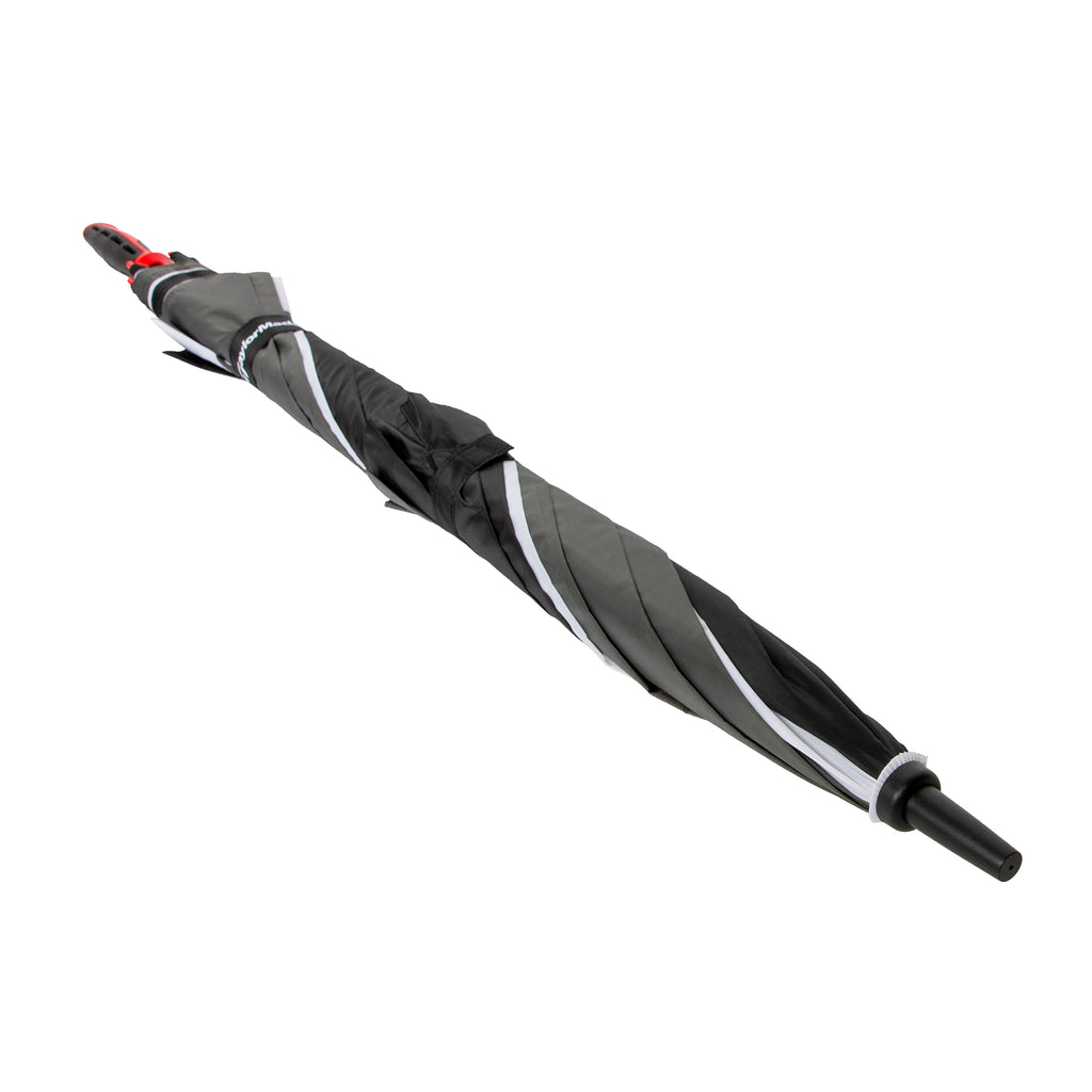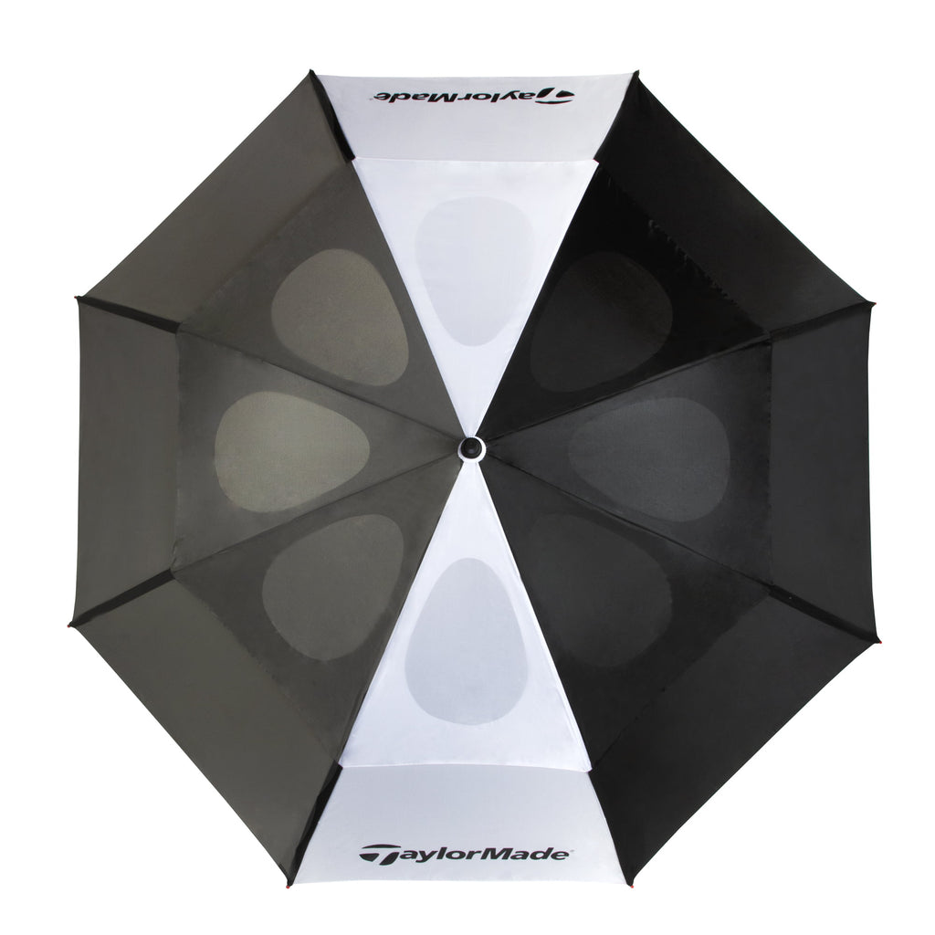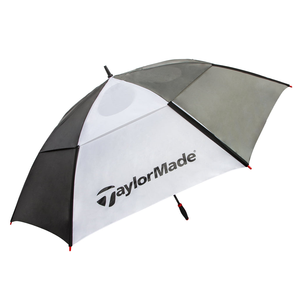 The 68-inch arc TaylorMade golf umbrella is our best and biggest! It’s oversized to easily cover 2 (or more), while the vented double canopy, pressure release vents, and elastic straps help it stand up to even the windiest conditions.