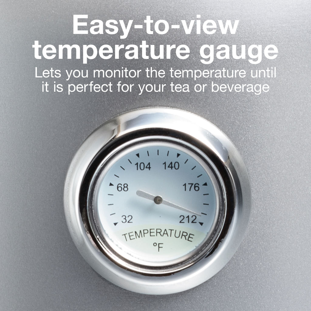 - EASY-TO-VIEW TEMPERATURE GAUGE. The large 32° to 212° F temperature gauge on the stainless steel electric tea kettle makes it easy for you to monitor the water's temperature until it is perfect for your tea or beverage.