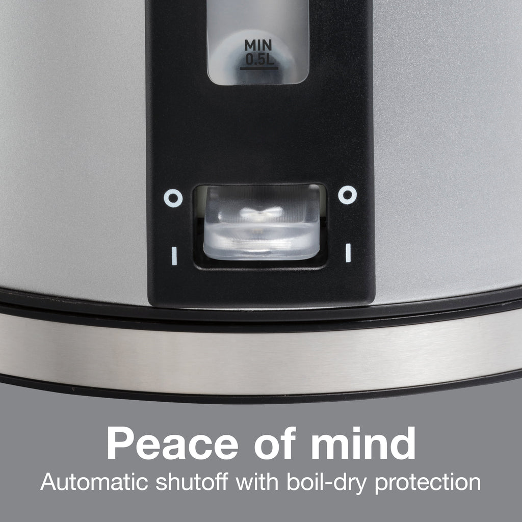 - PEACE OF MIND WITH AUTOMATIC SHUTOFF AND BOIL-DRY PROTECTION. The automatic shutoff feature with boil-dry protection keeps the kettle from scorching because the kettle will turn itself off right after water comes to a boil.