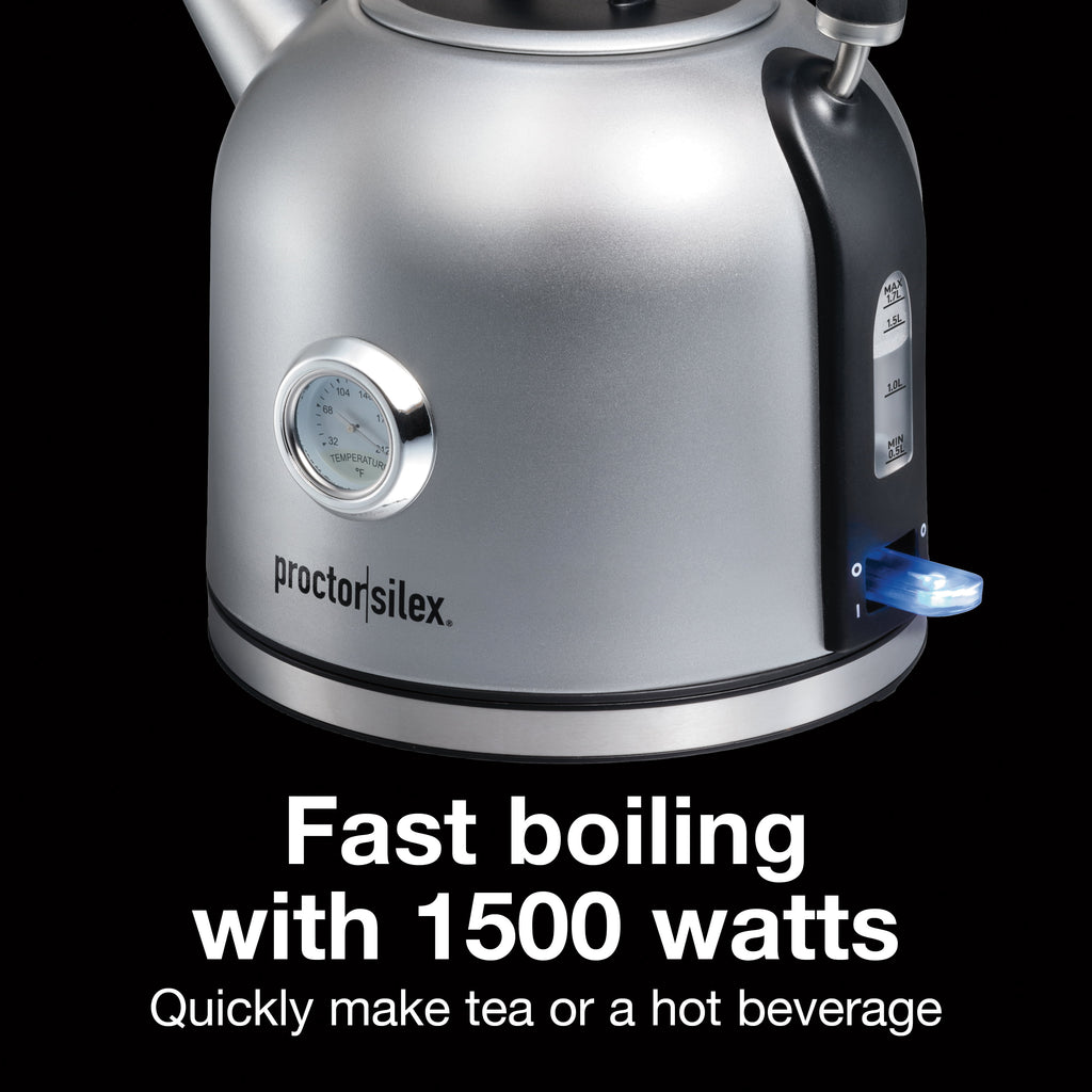 The Proctor Silex® 1.7 Liter Electric Dome Kettle has 1500 watts of power for fast boiling and automatic shutoff with boil-dry protection for peace of mind. The Proctor Silex 1.7 Liter Electric Dome Kettle was designed for simple water heating and boiling. To heat water, simply fill the kettle with water and press the on/off switch down. As the water heats up, you can monitor the easy-to-view temperature gauge until it reaches the perfect temperature for your tea or beverage. If you're simply boiling water, let the water come to a boil and the kettle will shut off automatically. This kettle features convenient cord-free serving so you can bring the kettle to the table or anywhere hot water is needed. The spout's mesh filter helps capture hard-water deposits and removes for easy cleaning. The durable stainless steel construction provides long-lasting performance. An easy-to-view water window allows you to effortlessly monitor the water level while the cord wrap makes storage simple. Backed by a 3 year limited warranty.