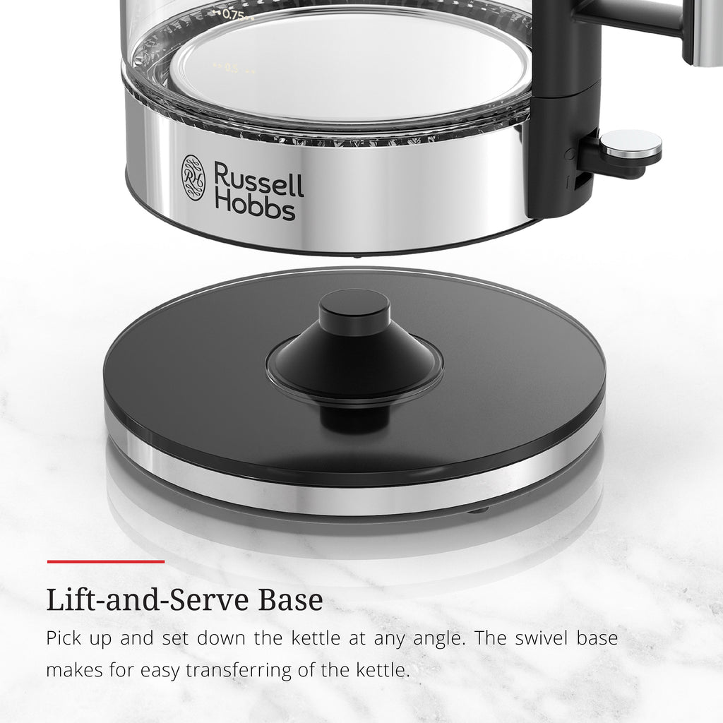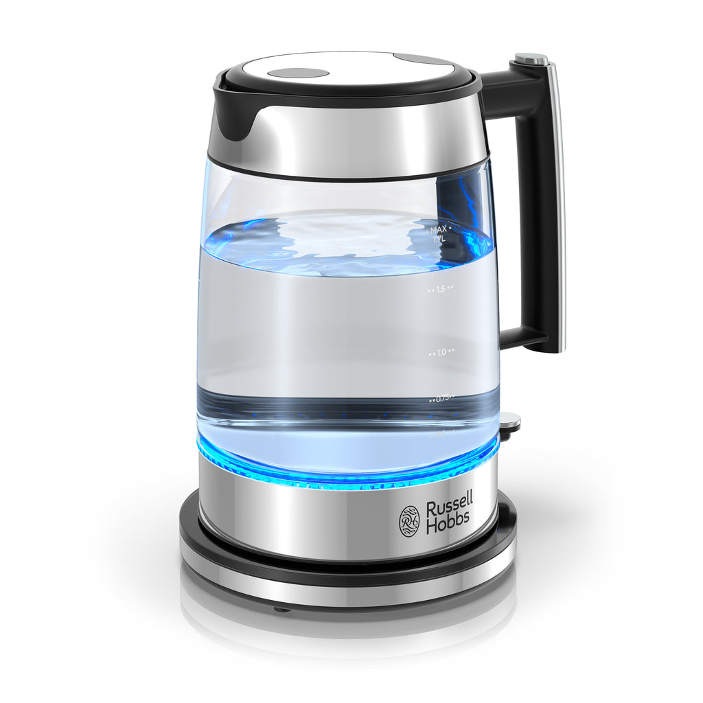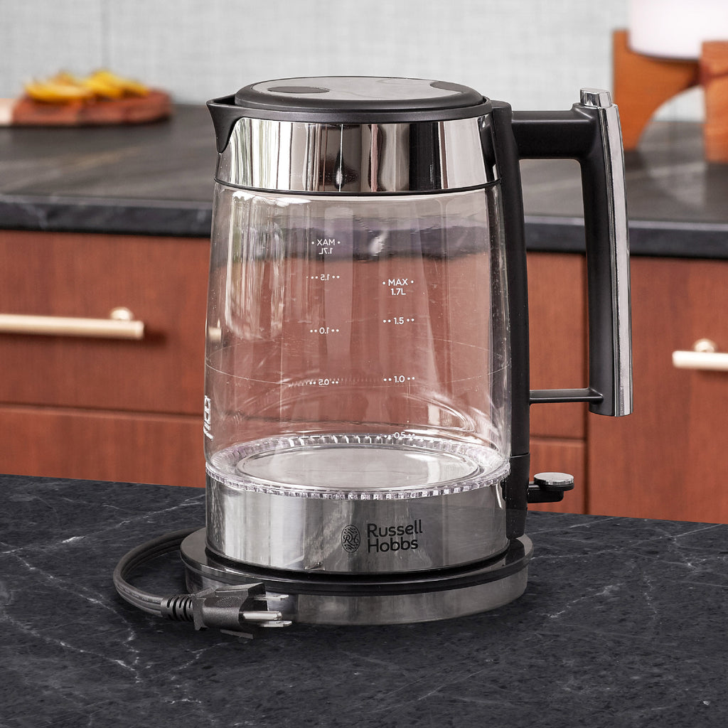 The process of bringing water to a boil may be as old as time, but that doesn?t mean your kettle has to be. The RUSSELL HOBBS Glass Electric Kettle features eye-catching blue LEDs that illuminate while water boils, offering an ultra modern feel to a more efficient method of boiling water. Whether you?re a devoted tea aficionado or enjoy hot cocoa, oatmeal, or French press coffee, this kettle is as useful as it is attractive. You?ll soon discover it?s not only one of your favorite small kitchen appliances, you won?t be able to live without it. The premium glass construction displays the rapid boiling of up to 1.7L of water, with measurement lines for accurate filling. To serve, simply lift the kettle at any angle from the base, and watch as the drip-free pour spout delivers a single stream of water into the intended cup or bowl. Additionally, the removable anti-scale filter helps prevent mineral buildup from passing through the kettle?s spout. Enjoy the perfect cup, at the perfect temperature every time.