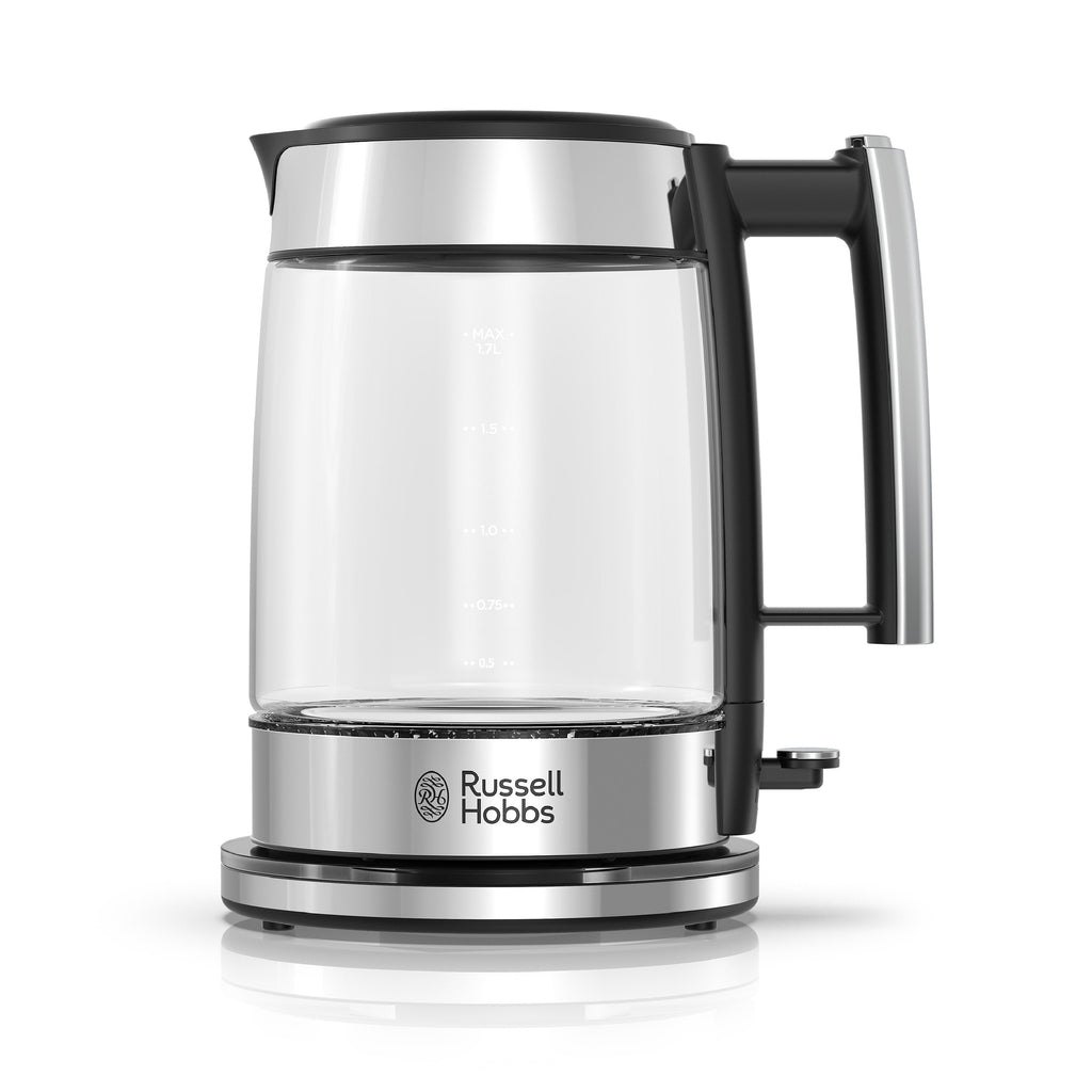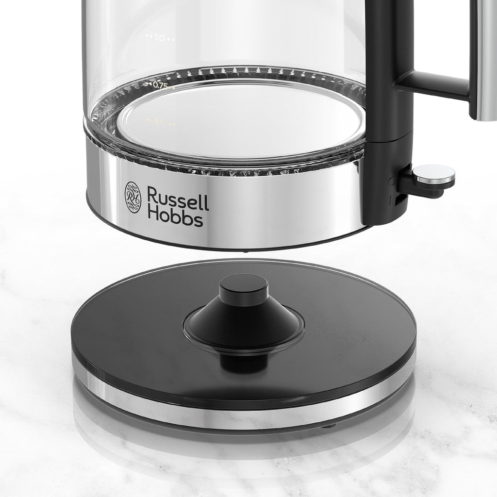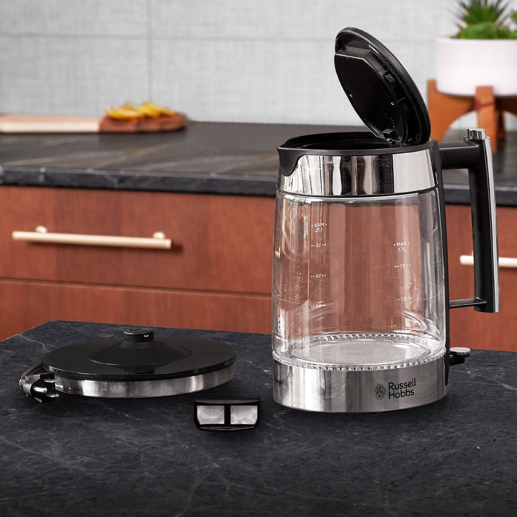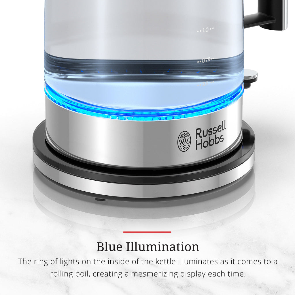 The process of bringing water to a boil may be as old as time, but that doesn?t mean your kettle has to be. The RUSSELL HOBBS Glass Electric Kettle features eye-catching blue LEDs that illuminate while water boils, offering an ultra modern feel to a more efficient method of boiling water. Whether you?re a devoted tea aficionado or enjoy hot cocoa, oatmeal, or French press coffee, this kettle is as useful as it is attractive. You?ll soon discover it?s not only one of your favorite small kitchen appliances, you won?t be able to live without it. The premium glass construction displays the rapid boiling of up to 1.7L of water, with measurement lines for accurate filling. To serve, simply lift the kettle at any angle from the base, and watch as the drip-free pour spout delivers a single stream of water into the intended cup or bowl. Additionally, the removable anti-scale filter helps prevent mineral buildup from passing through the kettle?s spout. Enjoy the perfect cup, at the perfect temperature every time.